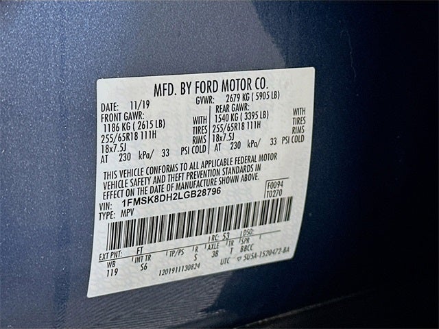 Blue Metallic 4WD 10-Speed Automatic 2.3L EcoBoost I-4 4WD, 1st & 2nd Row Heated Seats, Comfort Package, Heated Steering Wheel, 3.58 Non-Limited-Slip Rear Axle Ratio, 3rd row seats: bench, 4-Wheel Disc Brakes, 6 Speakers, ABS brakes, ActiveX Captain's Chairs, Air Conditioning, Alloy wheels, AM/FM radio: SiriusXM, AM/FM Stereo, Auto High-beam Headlights, Automatic temperature control, Brake assist, Bumpers: body-color, Compass, Delay-off headlights, Driver door bin, Driver vanity mirror, Dual front impact airbags, Dual front side impact airbags, Electronic Stability Control, Emergency communication system: SYNC 3 911 Assist, Equipment Group 202A, Exterior Parking Camera Rear, FordPass Connect, Four wheel independent suspension, Front anti-roll bar, Front Bucket Seats, Front Center Armrest, Front dual zone A/C, Front reading lights, Fully automatic headlights, Heated door mirrors, Illuminated entry, Knee airbag, Leather steering wheel, LED Fog Lamps, Low tire pressure warning, Occupant sensing airbag, Outside temperature display, Overhead airbag, Overhead console, Panic alarm, Passenger door bin, Passenger vanity mirror, Power door mirrors, Power driver seat, Power Liftgate, Power passenger seat, Power steering, Power windows, Rear air conditioning, Rear anti-roll bar, Rear reading lights, Rear window defroster, Rear window wiper, Remote keyless entry, Remote Start System, Roof rack: rails only, Security system, Speed control, Speed-sensing steering, Speed-Sensitive Wipers, Split folding rear seat, Spoiler, Steering wheel mounted audio controls, SYNC 3 Communications & Entertainment System, SYNC 3/Apple CarPlay/Android Auto, Tachometer, Telescoping steering wheel, Tilt steering wheel, Traction control, Trip computer, Unique Cloth Captain's Chairs, Variably intermittent wipers, Wheels: 18 5-Spoke Sparkle Silver-Painted Alum, 4WD, 1st & 2nd Row Heated Seats, Comfort Package, Heated Steering Wheel.
